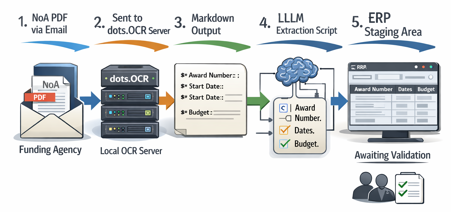The burden of manually re-entering grant data from PDF documents is a hidden cost that slows down research and creates compliance risks across university research offices. The good news is that modern AI-powered OCR technology has finally matured to the point where it can reliably read even the most complex federal grant documents. dots.OCR in particular represents a major step forward, offering the accuracy of expensive cloud services in a package that can run securely on campus without outside data sharing. By automating the most tedious parts of grant setup, research administrators can spend more time on meaningful work — supporting faculty researchers and managing compliance risk. The digital future of research administration is here, and it fits on a standard office workstation.